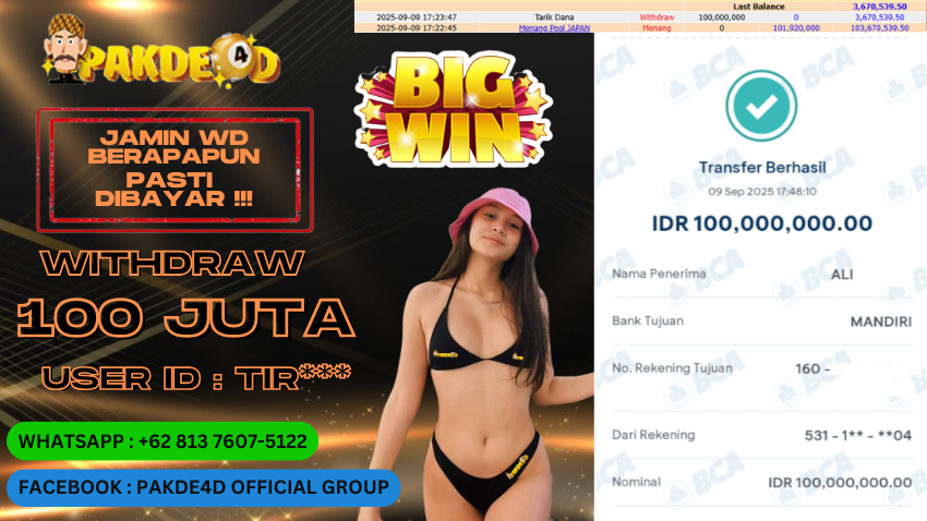 Selamat Kepada Member Setia PAKDE4D dengan USER ID : TIR*** di PERMAINAN JAPAN POOLS sebesar Rp. 100.000.000,- LUNAS langsung mendarat ke rekening tanpa bertele – tele. Terimakasih telah mempercayakan PAKDE4D sebagai Situs Bandar Terpercaya dan Terjamin Aman! Tunggu apalagi? Daftar sekarang juga bersama PAKDE4D dan dapatkan berbagai promo menarik setiap harinya.