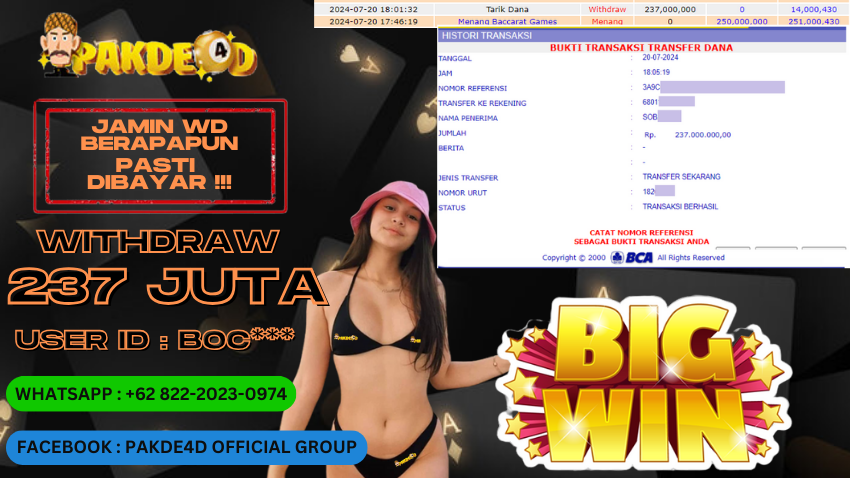 Selamat Kepada Member Setia PAKDE4D dengan USER ID : BOC*** di PERMAINAN LIVE CASINO BACCARAT sebesar Rp. 237.000.000,- LUNAS langsung mendarat ke rekening tanpa bertele – tele. Terimakasih telah mempercayakan PAKDE4D sebagai Situs Bandar Terpercaya dan Terjamin Aman! Tunggu apalagi? Daftar sekarang juga bersama PAKDE4D dan dapatkan berbagai promo menarik setiap harinya.