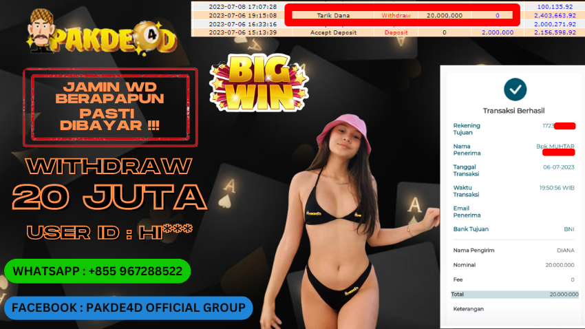 Selamat Kepada Member Setia PAKDE4D dengan USER ID : HI*** di PERMAINAN LIVE CASINO sebesar Rp. 20.000.000,- LUNAS langsung mendarat ke rekening tanpa bertele – tele. Terimakasih telah mempercayakan PAKDE4D sebagai Situs Bandar Terpercaya dan Terjamin Aman! Tunggu apalagi? Daftar sekarang juga bersama PAKDE4D dan dapatkan berbagai promo menarik setiap harinya.