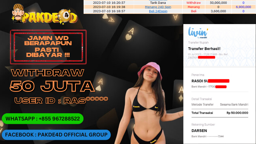 Selamat Kepada Member Setia PAKDE4D dengan USER ID : RASD**** di PERMAINAN LIVE CASINO sebesar Rp. 50.000.000,- LUNAS langsung mendarat ke rekening tanpa bertele – tele. Terimakasih telah mempercayakan PAKDE4D sebagai Situs Bandar Terpercaya dan Terjamin Aman! Tunggu apalagi? Daftar sekarang juga bersama PAKDE4D dan dapatkan berbagai promo menarik setiap harinya.