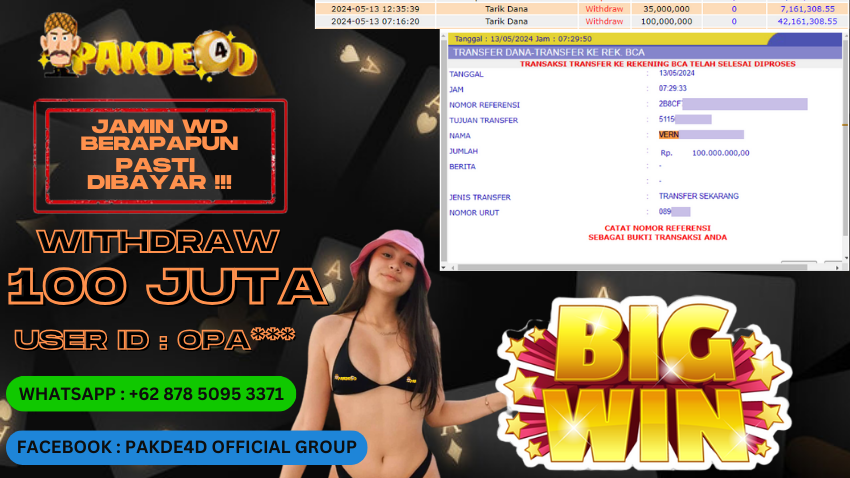 Selamat Kepada Member Setia PAKDE4D dengan USER ID : OPA*** di PERMAINAN LIVE GAME TOTO MACAU 4D JP RP. 100.000.000,- LUNAS LUNAS langsung mendarat ke rekening tanpa bertele – tele. Terimakasih telah mempercayakan PAKDE4D sebagai Situs Bandar Terpercaya dan Terjamin Aman! Tunggu apalagi? Daftar sekarang juga bersama PAKDE4D dan dapatkan berbagai promo menarik setiap harinya.