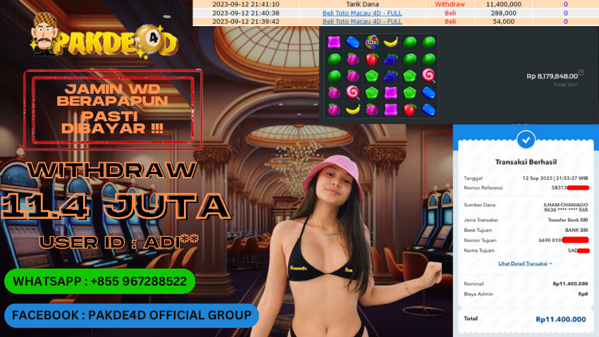 Selamat Kepada Member Setia PAKDE4D dengan USER ID : ADI*** di PERMAINAN TOGEL PASARAN TAIWAN sebesar Rp. 11.400.000,- LUNAS langsung mendarat ke rekening tanpa bertele – tele. Terimakasih telah mempercayakan PAKDE4D sebagai Situs Bandar Terpercaya dan Terjamin Aman! Tunggu apalagi? Daftar sekarang juga bersama PAKDE4D dan dapatkan berbagai promo menarik setiap harinya.