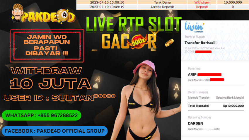 Selamat Kepada Member Setia PAKDE4D dengan USER ID : SULTAN****** di PERMAINAN SLOT sebesar Rp. 10.000.000,- LUNAS langsung mendarat ke rekening tanpa bertele – tele. Terimakasih telah mempercayakan PAKDE4D sebagai Situs Bandar Terpercaya dan Terjamin Aman! Tunggu apalagi? Daftar sekarang juga bersama PAKDE4D dan dapatkan berbagai promo menarik setiap harinya.