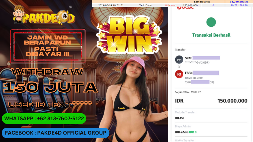 Selamat Kepada Member Setia PAKDE4D dengan USER ID : FXT******* di PERMAINAN SLOT sebesar Rp. 150.000.000,- LUNAS langsung mendarat ke rekening tanpa bertele – tele. Terimakasih telah mempercayakan PAKDE4D sebagai Situs Bandar Terpercaya dan Terjamin Aman! Tunggu apalagi? Daftar sekarang juga bersama PAKDE4D dan dapatkan berbagai promo menarik setiap harinya.