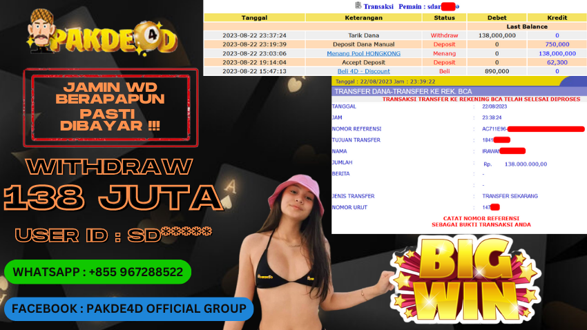 Selamat Kepada Member Setia PAKDE4D dengan USER ID : *** di PERMAINAN TOGEL PASARAN TAIWAN sebesar Rp. .000.000,- LUNAS langsung mendarat ke rekening tanpa bertele – tele. Terimakasih telah mempercayakan PAKDE4D sebagai Situs Bandar Terpercaya dan Terjamin Aman! Tunggu apalagi? Daftar sekarang juga bersama PAKDE4D dan dapatkan berbagai promo menarik setiap harinya.