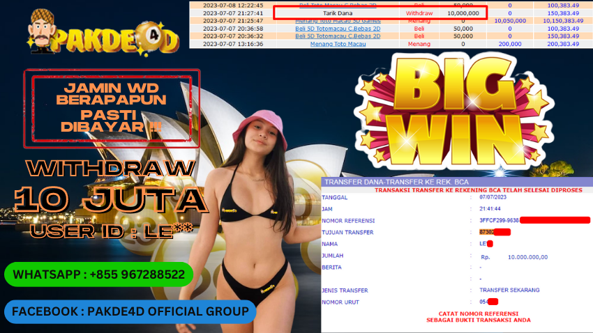 Selamat Kepada Member Setia PAKDE4D dengan USER ID : LE** di PERMAINAN TOGEL TTM5D sebesar Rp. 10.000.000,- LUNAS langsung mendarat ke rekening tanpa bertele – tele. Terimakasih telah mempercayakan PAKDE4D sebagai Situs Bandar Terpercaya dan Terjamin Aman! Tunggu apalagi? Daftar sekarang juga bersama PAKDE4D dan dapatkan berbagai promo menarik setiap harinya.